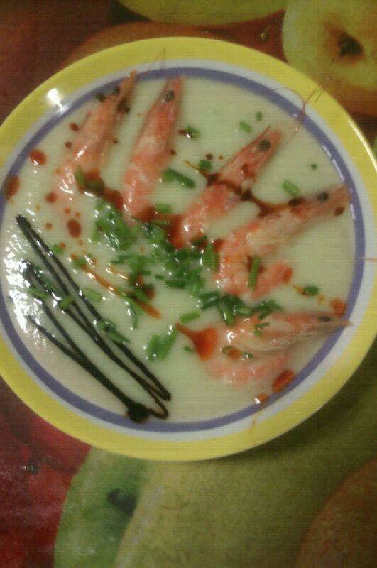 La crema tiene que estar bien fresquita y para que quede bonito, primero poner la crema, luego los langostinos a un lado, el cebollino cortado fino y hacemos un dibujo con aceite de oliva y crema de vinagre balsámico (opcional).